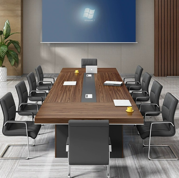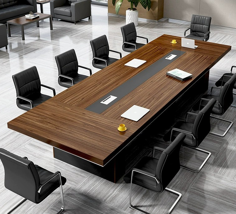 Crafted from high-quality engineered wood, the table boasts a durable laminate finish that resists scratches, stains, and heat, ensuring longevity and maintaining its polished appearance over time. The rich wood grain, available in finishes such as mahogany, walnut, or oak, radiates a warm, inviting presence while maintaining a sleek corporate look.