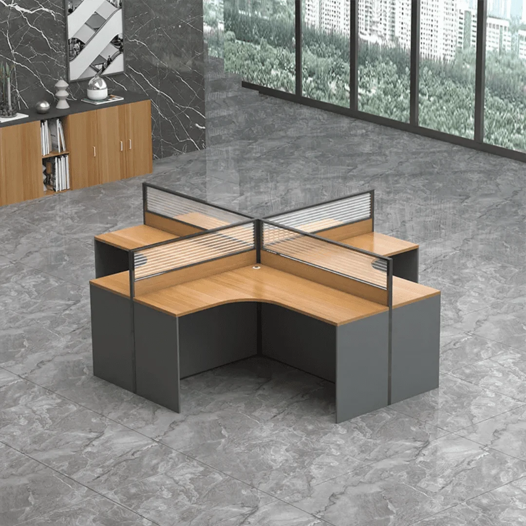 This setup allows four people to work comfortably in one unit. Each user gets enough space for a computer, documents, and office tools. As a result, teams can collaborate easily while staying organized and focused.